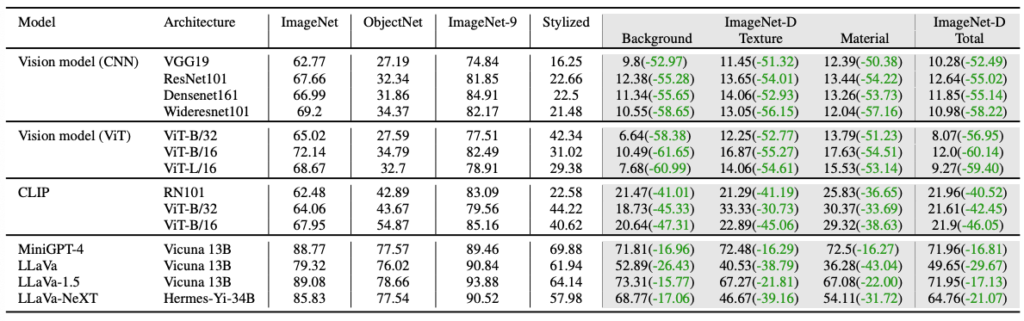 상단 그림은 제안하는 ImageNet-D 를 테스트로 평가했을 때, CLIP 모델이 예측 실패한 세 가지를 나타냅니다. text에 의존하여 이미지를 생성하기 때문에, 기존 데이터셋들의 corruption 혹은 텍스처와는 다르게 다른 요소(배경 등)를 변경할 수 있다는 특징이 있습니다. 해당 데이터셋을 사용하였더니 MiniGPT-4, LLaVa 와 같은 최신 모델에서도 정확도가 크게 하락하였다고 합니다.