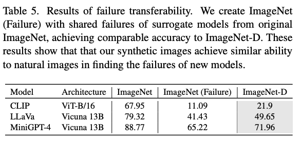 그 결과 테이블 5와 같이 ImageNet-D와 ImageNet (Failure)이 유사한 정확도를 달성하였습니다. 이를 통해 합성 이미지가 자연적으로 수집된 이미지와 유사한 Transferable failure를 가질 수 있음을 확인하였습니다. 다만 이미지넷과 달리 이미지넷-D는 데이터수집 비용이 저렴하고 효율적으로 확장할 수 있다는 장점을 가진다고 하였습니다.