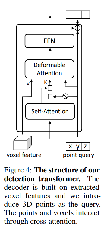 이어서 트랜스포머 디코더 모듈에 대해서 살펴보도록 하겠습니다. 먼저 트랜스포머는 추출된 복셀 feature을 기반으로 작동하며 3차원 물체 검출을 위해 set 예측 방식을 사용합니다. 쿼리를 앵커 박스로 계산하는 최근 2D 트랜스포머 기반 검출기에서 영감을 받아 3차원 공간의 3D 포인트를 쿼리로 활용하며 트랜스포머 모듈의 구조는 Fig. 4와 같습니다.