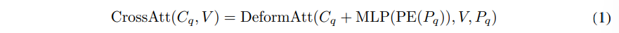 q번째 물체를 표현하기 위한 q번째 포인트를 P_q = (x_q, y_q, z_q)라고 정의하면 C_q \in \mathbb{R}^D가 해당 포인트의 content 쿼리가 되고, D는 디코더 임베딩의 차원 입니다. 크로스 어텐션 모듈에 대해서 deformable 어텐션을 사용하고, P_q를 포인트-복셀 상호작용의 기준이 되는 포인트로 간주합니다. deformable DETR의 디코더와 다르게, 본 논문의 디코더에서는 기준 포인트 P_q를 직접 학습합니다. 복셀 feature을 V로 가정하였을 때 크로스 어텐션의 과정을 식으로 정의하면 식(1)과 같습니다.
