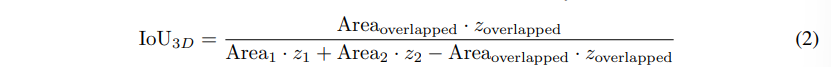 기존 트랜스포머 기반의 2D 검출기는 보통 L1 loss와 일반화된 IoU loss를 이용하는데요, 여기서 일반화된 IoU는 다양한 스케일에 대해서 L1 loss의 문제를 완화할 수 있다고 합니다. 그러나 3차원 바운딩 박스의 경우에는 IoU loss를 계산이 2D보다 더 복잡합니다. 하나의 3차원 바운딩 박스는 일반적으로 bb = (x, y, z, w, l, h, \theta)로 표시되는데, 여기서 (x, y, z)는 박스의 중심 좌표이며 (w, l, h)는 박스의 크기 그리고 \theta는 회전 각도를 나타냅니다. 이러한 박스 bb1, bb2 두 개의 일반적인 3D IoU 계산을 정의하면 식(2)와 같습니다.