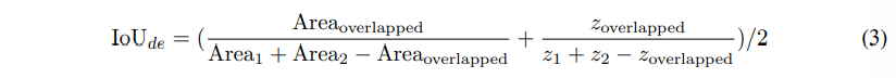 식(2)를 통해서 3D IoU 계산은 (x, y, w, l, \theta)를 포함하는 바운딩 박스 영역인 xy 공간과 박스 height에 해당하는 z 공간, 이렇게 두 공간으로 구성된다는 것을 확인할 수 있습니다. 학습할 때 이 두 공간의 gradient가 합쳐져 한 공간에서의 최적화가 다른 공간에서의 최적화에 방해가 되어 학습 과정이 불안정해질 수 있다고 합니다. 결국 식(2)와 같은 일반적인 3D IoU는 검출기에서 최적화하는 데 어려움이 존재합니다. 바운딩 박스의 regression을 위해 이미 L1 loss가 존재하는 트랜스포머 기반 3차원 물체 검출기에서  3D IoU의 최적화 문제는 기존에 2D 트랜스포머 기반 검출기에서는 스케일 문제를 완화할 수 있었던 효과가 크게 감소하게 됩니다.