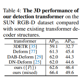 타 트랜스포머 기반 방법론과 비교한 ablation study 입니다. 3DETR은 point 기반 feature extractor을 사용하여 point representation여서 성능이 다른 복셀 기반 방법론에 비해 제한되었다고 합니다. 해당 실험을 통해 저자는 3D 앵커 박스를 쿼리로 사용하는 기존 방법론이 쿼리 포인트보다 비교적 덜 효과적이라고 주장하고 있습니다.
