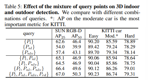 KITTI에서는 학습 불가능한 쿼리 포인트의 효과가 indoor scene에 비해 덜 중요하다는 것 확인할 수 있는데, 이는 outdoor 포인트 클라우드는 범위가 넓고 sparse하여 학습 불가능한 쿼리의 글로벌 정보 효과가 많은 배경 정보로 인해 상쇄될 수 있기 때문이라고 해석할 수 있습니다.