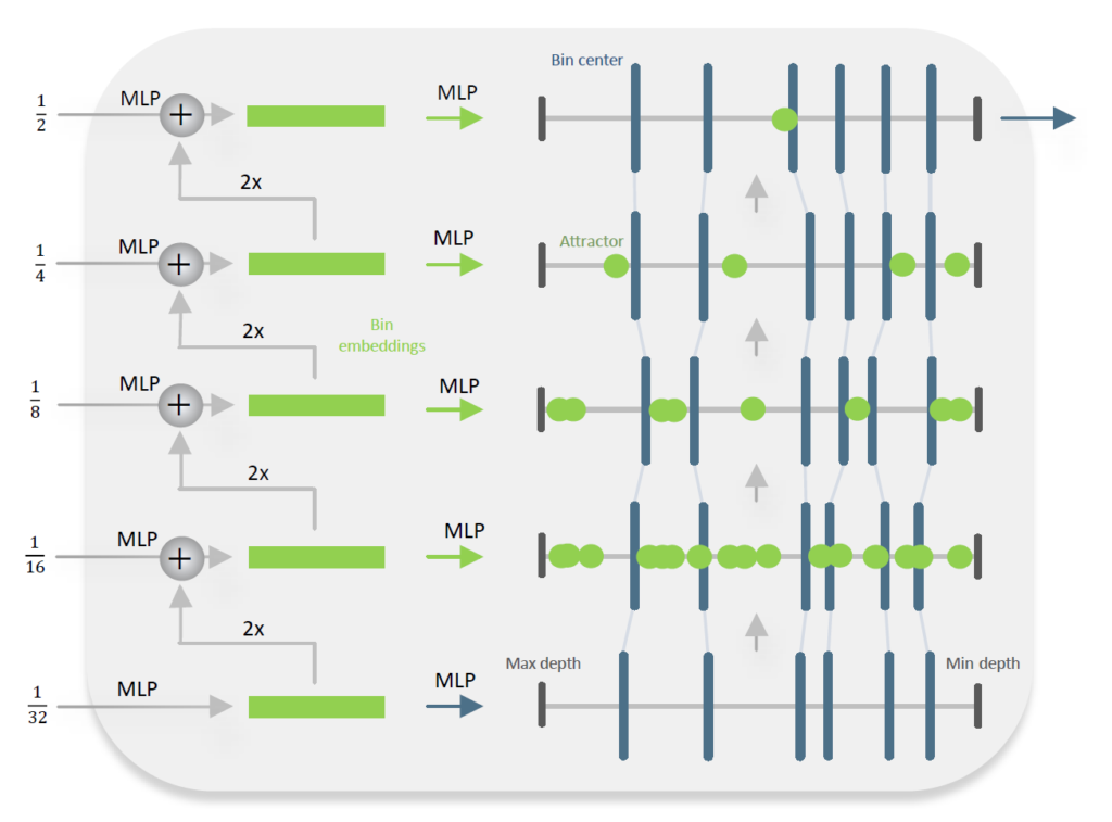 그래서 LocalBins 방법론의 경우 초기에 서로 다른 seed bin이 각 픽셀 별로 존재하게 되는데, 이 빈들은 모든 디코더 레이어마다 MLP 레이어를 통과하여 2개로 분리된다고 합니다. 결과적으로 N개의 디코더 레이어를 다 통과하고 나면 각 픽셀들은 2^n개의 시드 빈들이 생성되는 것이죠.