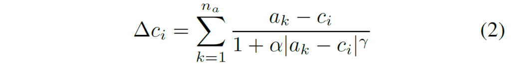 수식2에서 알파와 감마 값은 각각 attractor의 강도를 조절하는 하이퍼파라미터라고 합니다. 결과적으로 \triangle c_{i} 는 bin center를 의미하는 c의 위치를 조정하는 변화량 값으로 갱신된 bin 중심은 c'_{i} = c_{i} + \triangle c_{i} 로 표현할 수 있습니다.