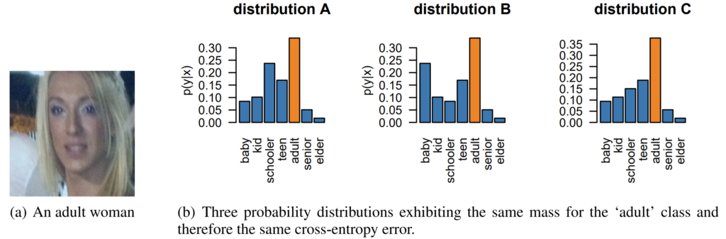 실제로 아래 그림은 얼굴 사진을 보고 나이를 맞추는 분류기인데, 모델이 예측한 3가지의 서로 다른 분포가 Cross-entropy로 error를 계산할 시 모두 동일한 값을 가진다고 합니다. 하지만 똑같은 CE error 값이라 할지라도, 분포 A와 B보다는 C라고 예측하는 것이 나이를 예측하는 관점에서는 더 정확하다고 볼 수 있습니다. 딱 봐도 어른인데 senior나 teen이 아닌 baby가 높은 분포로 예측이 되면 학습이 잘 못 되었다고 볼 수 있는 것이겠죠?