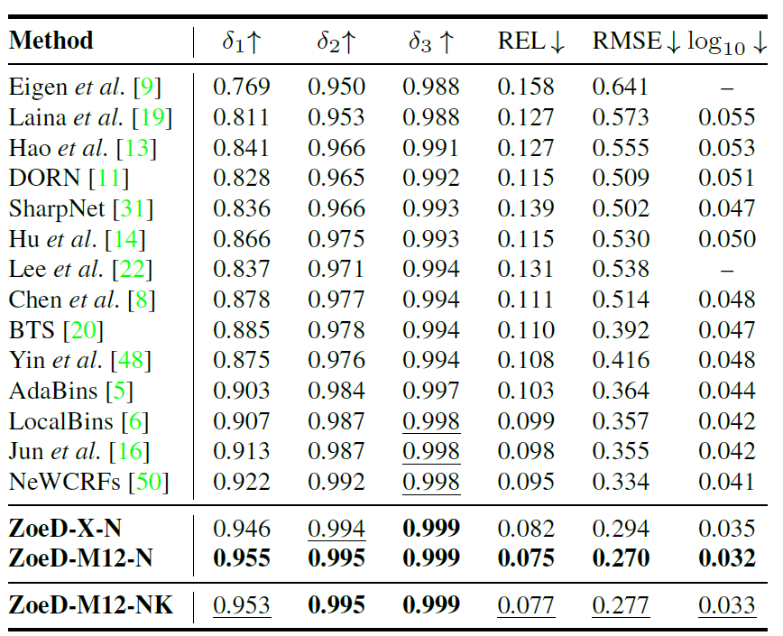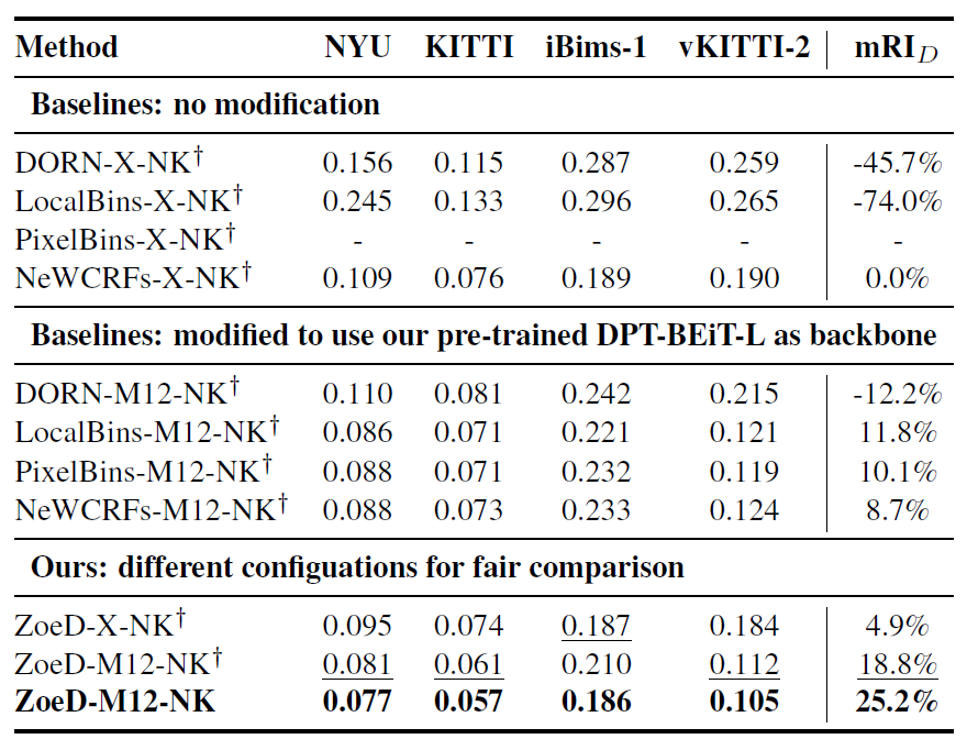 테이블에서 모델 이름이 ZoeD-{RDPT}-{MFT} 꼴로 표기가 되어있을텐데, 앞에 ZoeD는 자신들의 방법론 이름인 ZoeDepth의 약자이며, RDPT는 relative depth estimation 사전학습을 하였는지 안하였는지를 의미합니다. 그래서 X이면 사전학습을 안한 것이고, M12면 12개의 Mixed dataset으로 사전학습을 수행했다는 것이죠. 마지막으로 MFT는 metric depth estimation 학습을 위한 데이터 셋 이름으로 각각 N(YUv2), K(ITTI)로 구분이 됩니다.