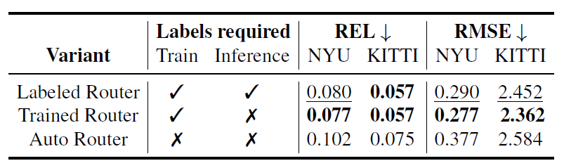 이러한 routing 방식으로 크게 3가지 방식을 골랐는데, 첫번째 방식은 그냥 학습과 추론 단계에서 모두 지금 입력이 어떠한 상황인지를 알려주는 label 제공 방식이며, 두번째 방식은 입력에 대하여 상황을 판단할 수 있는 분류기를 학습시키는 방식 (때문에 학습 때는 입력 상황에 대한 label이 필요로 하지만, 추론 단계에서는 필요가 없음.), 마지막으로 두번째 방식과 동일하게 학습 가능한 분류기가 따로 존재하지만, 학습 시에도 환경에 대한 레이블이 없는 경우라고 합니다. 근데 마지막 autor Router 같은 경우에는 도대체 어떻게 학습을 시켰는지 모르겠네요? 그냥 depth estimation 학습에 사용되는 loss를 분류기에도 적용한 거 같기도 하구요.
