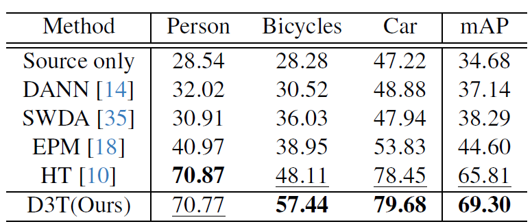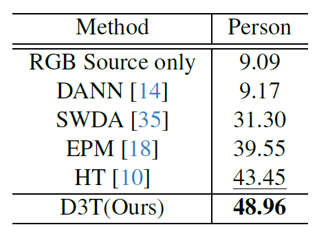 위에서 D3T(Ours)를 제외한 타 방법론들은 원래 RGB->Foggy RGB를 수행하던 연구들인데, 저자들이 re-implementation을 한 결과입니다.