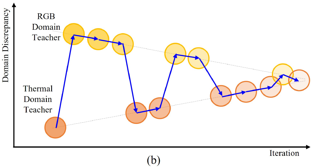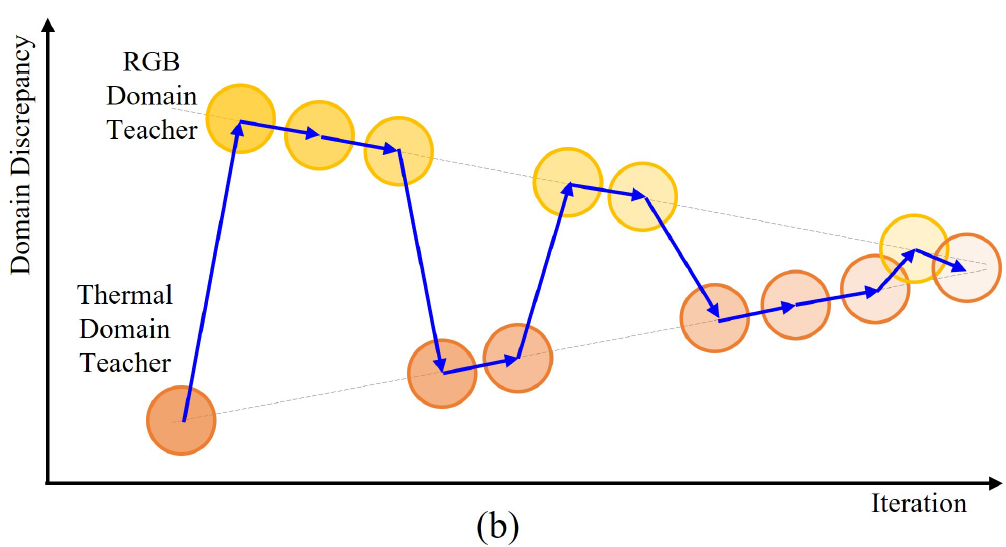 하지만 본 논문에서는 RGB와 Thermal 사이의 domain gap이 꽤나 상이하기 때문에 공통된 mean teacher를 하나만 사용하게 되면 꽤나 모델 학습에 부정적인 영향을 끼칠수 있다고 주장합니다.