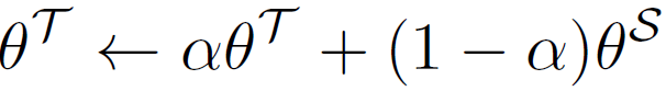 Mean Teacher는 학습이 되는 모델이 아니며, 아래 수식을 통해 student parameter를 EMA 계산하여 update가 수행되게 됩니다.