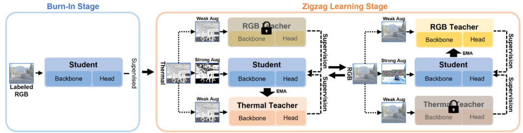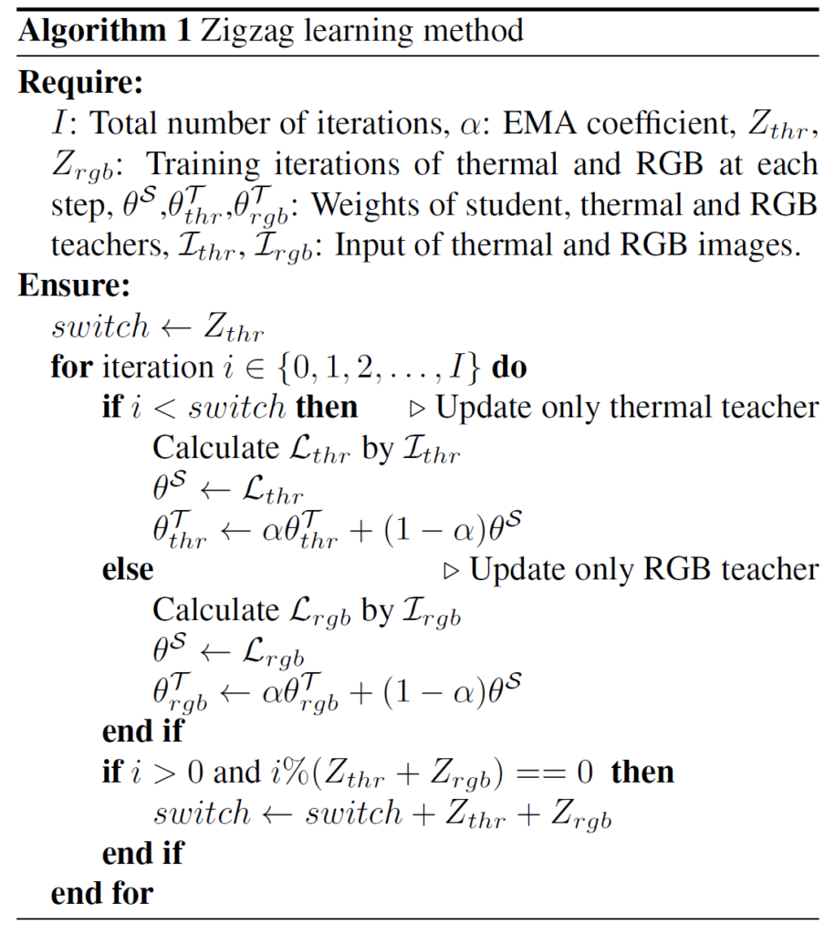 Zigzag(지그재그) 라는 이름에서 아실 수 있다시피, RGB와 Thermal mean teacher 둘 중 하나를 번갈아가면서 선택해서 adaptation 과정을 수행합니다.