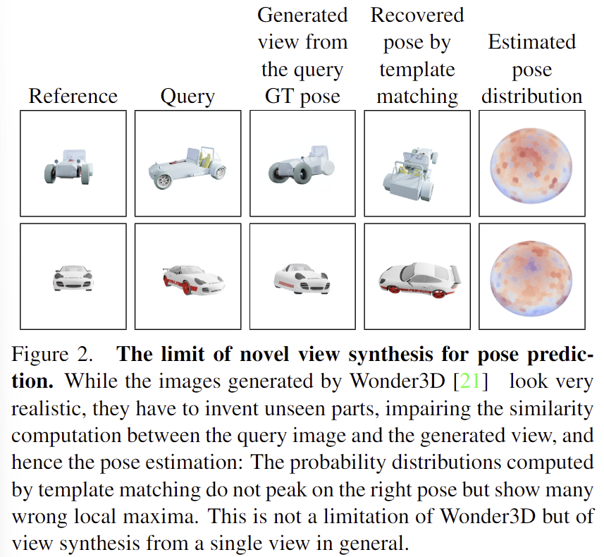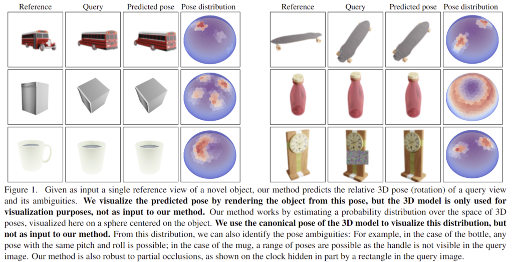 또한, 기존의 새로운 view에 대한 영상 합성은 일반적으로 하나의 이미지를 생성하고자 하지만 일부 보이지 않는 부분에 대해서는 영상을 만들어내야 하므로 생성된 영역으로 인해 잘못된 pose를 예측하게 된다는 문제가 있습니다. 위의 [Figure 2]에서 확인할 수 있듯이, 그럴듯한 이미지가 생성되지만(3열), query와는 차이가 있어 정확한 pose 추정이 어렵습니다. (5열은 예측되는 pose에 분포로, 예측된 pose의 분포가 적절한 곳에 밀집되어있지 않다는 것을 의미합니다.) 이러한 모호성을 해결하고자 NOPE는 가능한 모든 형태의 평균을 예측한 뒤 예측의 평균을 template으로 취급합니다. 이를 통해 새로운 view에 대한 모호성을 처리하고, template matching을 통해 빠르고 occlusion에도 강인하게 pose이 가능하다고 합니다. 또한, 3D 모델을 이용하지 않고, 단일 view만을 이용하여도 대칭에 의한 모호성에 대응이 가능하다고 합니다. 아래의 [Figure 1]은 이에 대한 예시로, pose를 보다 명확하게 예측하며, 대칭인 객체에 대해서도 대응이 가능하다는 것을 보여줍니다.