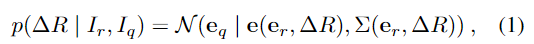 대상 물체에 대에 reference 이미지 I_r와 query 이미지 I_q가 주어졌을 때, I_rI_q 사이의 상대적 pose \Delta R일 확률 p(\Delta R | I_r, I_q)을 구하는 것이 목표입니다. 이러한 확률이 임베딩 공간에서 정규분포를 따른다고 가정하며 아래의 식(1)로 정의합니다.
