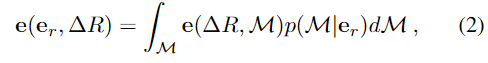 대상 물체의 \Delta R에서 가능한 3D 형태의 평균 embedding을 \mathbb{e}(\mathbb{e}_r,\Delta R)로 사용하며 아래의 식(2)로 정의합니다.