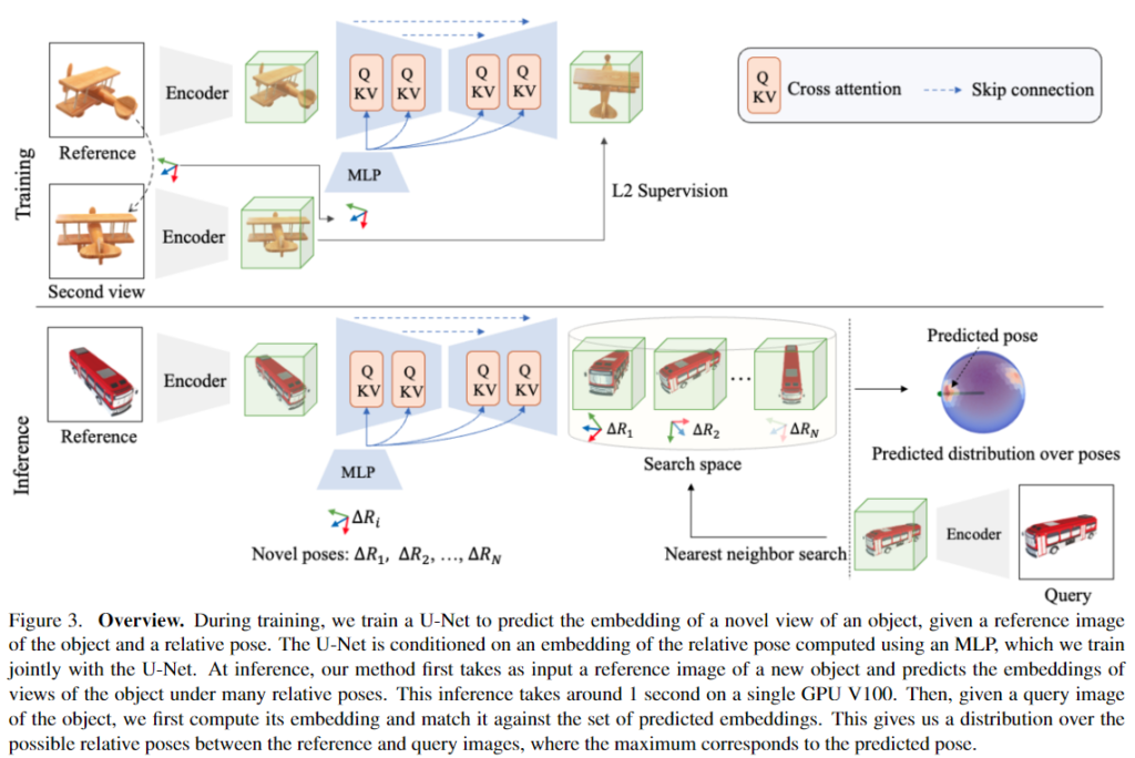 매 iteration마다 N쌍의 reference 이미지와 상대적 pose를 알고 있는 동일 객체에 대한 또 다른 이미지(query로 사용)로 배치를 구축하고, U-Net은 reference 이미지의 embedding을 입력으로, 상대 pose의 embedding을 condition으로 사용하여 두번째 이미지의 embedding을 예측합니다. 이렇게 예측된 embedding과 query 이미지의 embedding 사이의 유클리드 distnace가 최소화 되도록 U-Net 구조와 MLP를 함께 학습합니다. 이때 VAE 네트워크의 사전학습된 파라미터를 이용하는 encoder는 freeze한다고 합니다.