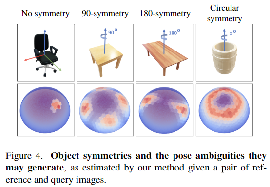 [Figure 4]는 서로 다른 3가지 대칭적인 형태를 가지는 객체에 대하여 reference 와 본 적 없는 query view에 대한 pose 분포를 시각화 한 것으로, 유사성 점수가 높은 영역의 개수가 object의 대칭으로 인해 발생하는 모호한 부분의 수와 일치하는 것을 볼 수 있습니다. 대칭이 아닌 객체는 한 영역에 집중되는 예측이 가능함을 확인할 수 있으며, 90°와 180°, 축에 대해 모두 대칭인 경우 각각 대칭되는 영역에 대응되는 view에 유사도 점수가 높은 것을 확인할 수 있습니다. (높은 확률을 가지는 pose가 대칭을 모델링할 수 있다는 점이 굉장히 인상깊었습니다 ㅎㅎ)
