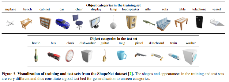 FORGE**라는 기존의 합성 데이터 생성 방식을 이용하여 합성 데이터를 생성합니다. ShapeNet을 이용하여 합성 데이터 셋을 생성합니다. 학습을 위해 13개 카테고리(airplane, bench, cabinet, car, chair, display, lamp, loudspeaker, rifle, sofa, table, telephone, vessel)에서 각각 무작위로 1,000개의 인스턴스를 선택하여 총 13,000개의 인스턴스를 선택합니다. 이후 평가를 위해 두가지의 test set을 구축합니다. 첫 번째 test set은 학습 카테고리에 대한 50개의 새로운 인스턴스를 이용하여 “novel instances” set을 구성합니다. 두 번째 test set은 학습에 사용하지 않은 10개의 unseen 카테고리(bus, guitar, clock, bottle, train, mug, washer, skateboard, dishwasher, and pistol)에 대하여 각각 100개의 인스턴스를 이용하여 “novel category” set을 구성합니다. 각 3D 모델에 대해 카메라 pose를 무작위로 선택하여 5개의 reference 이미지와 5개의 query 이미지를 생성합니다.