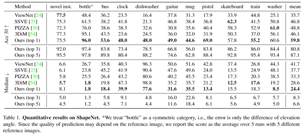 • 합성 데이터(ShapeNet)에 대한 평가를 위해 상대 pose의 오차를 기반으로 2가지 평가지표를 이용합니다. 먼저 Acc30은 pose 오차가 30° 이하일 경우 올바른 pose 예측으로 판단하여 accuracy를 측정하며, 예측된 pose중 distance가 가까운 상위 3개나 5개에 대한 결과를 리포팅합니다.