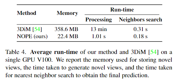 • 앞서 빠른 추론이 가능하다고 언급한 것에 대한 실험적 결과입니다. diffusion 방법론과 다르게 새로운 view에 대한 embedding을 한번에 예측하는 방식을 통해 훨씬 빠르게 동작하였다고 합니다.(그런데 PIZZA 방식이나 다른 방법론에 대한 평가 결과가 누락되어있어서 .. 아쉽습니다.)