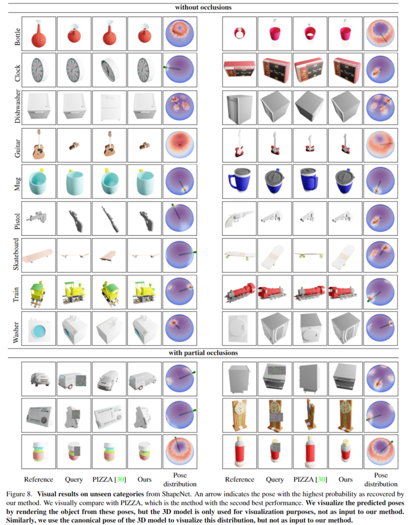 유의미한 부분에 occlusion이 발생하거나 대칭에 의해 pose에 대한 모호성이 발생하는 경우 query 이미지의 embedding과 생성된 embedding 사이의 distance를 통해 단일 pose를 예측할 수 있을 뿐만 아니라 reference view와 query view에 대한 가능한 모든 pose를 인식할 수 있습니다. 이는 앞서 문제 정의에서 설명한 대로 확률 분포를 사용하기 때문으로, 아래의 [Figure 4]를 이용하여 설명합니다.