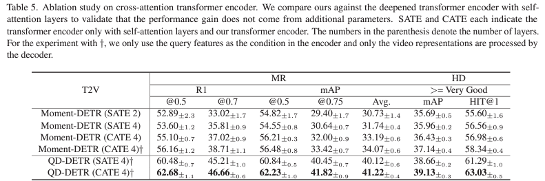 표에서 SATE는 self-attention transformer encoder를 의미합니다. Moment-DETR의 SATE4와 CATE4를 비교했을 때에도 성능 향상이 꽤나 큰 것을 보았을 때 우선 cross-attention 자체가 유의미한 성능 향상을 불러올 수 있는 것을 알 수 있습니다. 이는 QD-DETR에서도 마찬가지이며, 결과적으로 성능 향상은 추가적인 연산으로부터 온 것이 아니라, 텍스트 쿼리를 잘 활용한 것으로부터 온 것임을 논리적으로 증명하고 있다고 생각합니다.