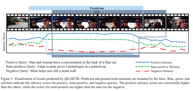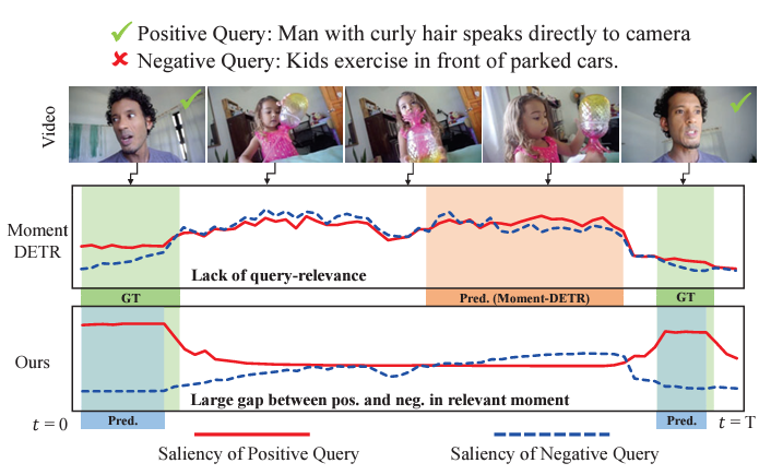 이를 바탕으로 saliency score 추세를 살펴보겠습니다. 계속 언급했던 기존 방법론 Moment-DETR은 엉뚱한 구간에서 높은 saliency score를 내뱉고 있습니다. 이 자체로도 문제가 되지만 저자가 이야기하는 더 큰 문제는, 아예 상응 구간이 존재하지 않는 negative query에 대해서도 positive query와 비슷한 경향의 score를 뽑아내고 있다는 점입니다. 본 모델이 수행하는 MR과 HD 모두 텍스트 쿼리를 기준으로 score가 생성되고 구간을 만들어내야 하기 때문에 텍스트 쿼리의 의미를 잘 파악하는 것이 중요한데, 어떤 텍스트 쿼리이든 상관없이 유사한 경향의 score를 내뱉고 있는 기존 방법론은 각 모달 정보에 대한 이해와 이들의 상호작용에 대한 이해를 바탕으로 예측을 수행하고 있다고 보기 어렵겠죠.
