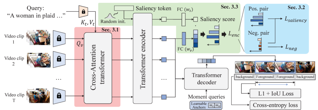 결국 3가지 contribution이 존재하는데, 첫 번째로 기존에는 인코더 단에서 텍스트-비디오 토큰을 concat한 후 self-attention을 수행했다면 QD-DETR에서는 명시적인 두 모달의 상호작용을 모델링하기 위해 바로 cross-attention을 수행해줍니다. 첫 번째는 feature-level에서 비디오 feature에 텍스트의 정보를 주입해주는 느낌이었습니다. 두 번째 contribution은 이보다 좀 더 명시적으로 텍스트 쿼리를 활용하는데, negative pair에 대한 saliency score는 0으로 가도록 만들어주는 loss를 설계합니다. 마지막 세 번째로, 달라지는 비디오와 텍스트 쿼리에 따라 dynamic한, 또는 adaptive한 saliency score를 만들어낼 수 있도록 saliency token을 도입합니다.