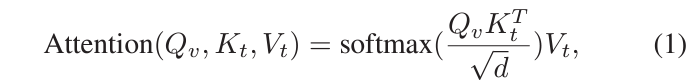 Query Q_{v}를 만들어주기 위해 비디오 feature를 projection하고, 나머지 K_{t}, V_{t}는 텍스트 feature로부터 projection하여 얻습니다. 이에 대한 cross-attention 연산은 아래 수식 1과 같습니다.