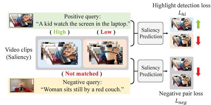 위 수식 2에 negative pair loss L_{neg}가 나타나있습니다. S(\cdot{})는 saliency score predictor를 의미하고, x_{v}^{neg}은 negative pair 간 cross-attention을 거친 feature를 의미합니다. 수식에 따라 negative pair 간 saliency score S(x_{v}^{neg}은 0으로 가도록 학습될 것입니다. 이 loss를 통해 그림 1에서 봤던 기존 방법론의 문제점인, 텍스트 쿼리를 고려하지 않고, 비디오 모달만 단독적으로 예측에 고려되는 상황을 방지할 수 있게 됩니다. 이제 어떤 쿼리가 들어오는지에 따라 모델이 각 상황에 맞는 saliency score를 내뱉을 것으로 기대할 수 있습니다.