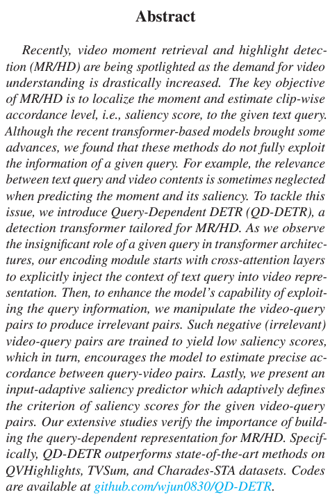 안녕하세요. 이번 주 X-Review에서는 23년도 CVPR에 게재된 <Query-Dependent Video Representation for Moment Retrieval and Highlight Detection>이라는 논문을 소개해드리겠습다. 성균관대 허재필 교수님 연구실에서 나온 논문이며, 해당 한국인 저자분이 본 task에 대해 아주 선도적인 연구를 진행하고있어 주목받고 있는 상황입니다. 깃허브를 보니 최근까지도 활발하게 코드를 관리해주고 있던데, 책임감 있는 모습이 존경스럽네요.