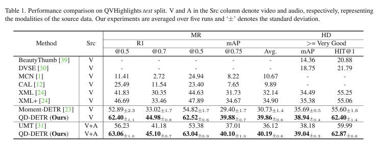 표 1은 QVHighlights 데이터셋에서의 MR과 HD 벤치마크 성능입니다. Src는 source domain을 의미하며, 기본적으로 제가 작성한 리뷰는 Video만을 다루는 상황을 설명드렸습니다. V+A는 Audio 모달을 추가로 사용했을 때의 성능이며, 추가 처리 없이 단순히 기존 베이스라인 방법과 동일하게 video feature에 audio feature를 concat하여 입력해준 것이 차이점입니다. Moment-DETR이 베이스라인 방법론으로서 처음 이 표의 틀을 잡을 때, 5회 평가하고 결과를 평균과 표준편차로 표현했기에 저자도 이 방식을 따랐다고 합니다.