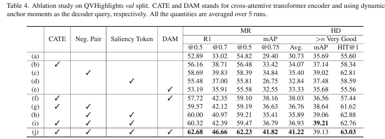 표 4는 QVHighlights val split에 대한 QD-DETR의 module-wise ablation 성능입니다. CATE는 맨 처음 feature 추출에 적용되는 cross-attention 사용 여부, Neg. Pair는 negative query와의 saliency score를 0으로 만들어주는 loss 사용 여부, saliency token은 saliency score 추출에 사용되는 별도의 token 사용 여부, DAM은 Dynamic Anchor Box 기법을 시간 축으로 가져와 활용했는지 여부를 의미합니다.