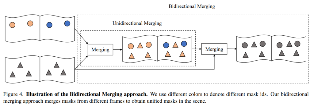 섹션 2.1.에서 3차원 마스크가 만들어지면 이제 Fig.4.과 같이 서로 다른 프레임에서 예측한 마스크를 양방향으로 병합하는 방식을 제안합니다. 인접한 두 프레임의 포인트 클라우드 X’ = \{x^1_1, x^1_2, . . ., x^1_m\}X^2 = \{x^2_1, x^2_2, . . ., x^2_n\}가 주어지는데, 여기서 m, n은 각각 X^1, X^2의 포인트 수를 나타냅니다. 이렇게 정의한 두 프레임의 포인트 클라우드 X^1, X^2 사이의 대응하는 매핑 M을 계산하게 됩니다. (i, j) \in M라고 정의한다면 포인트 x^i_i, x^2_jX^1, X^2 사이에서 일치하는 한 쌍의 포인트 입니다. 이러한 한 쌍을 어떻게 찾는지를 살펴보도록 하겠습니다. 먼저 앞서 할당한 마스크 ID가 있으니 X_1의 각 마스크 ID m에 대해 동일한 3차원 마스크 내에서 Q^1으로 표시되는 X^1의 포인트를 찾고, 찾은 ID가 m인 포인트의 수를 \sigma^1_m로 정의합니다. Q^1과 대응하는 X^2에서의 Q^2를 찾기 위해서 매핑 M을 활용합니다. Q^2에서 마스크 ID가 n인 포인트의 수를 \sigma^{1-2}_{mn}라고 정의하고, 전체 포인트 X^2에서 마스크 ID가 n인 포인트의 수를 \sigma^2_n이라고 정의해보겠습니다. 만약에 여기서 \sigma^{1-2}_{mn} > \delta \times min(\sigma^1_m, \sigma^2_n)이라면, X^1의 마스크 ID가 m인 마스크와 X^2의 마스크 ID가 n인 마스크가 매우 겹치는, 유사한 마스크임을 의미합니다. 따라서 이전 프레임에서 마스크 ID가 mX^2의 포인트에 대해 새로운 마스크 ID로 n을 할당하여 마스크를 병합하게 됩니다. 이러한 과정은 X^2의 마스크 ID를 기준으로도 반복하고 X^1의 포인트와 마스크 ID를 쿼리로 사용하는, 양방향 과정으로 반복하는 것 입니다.