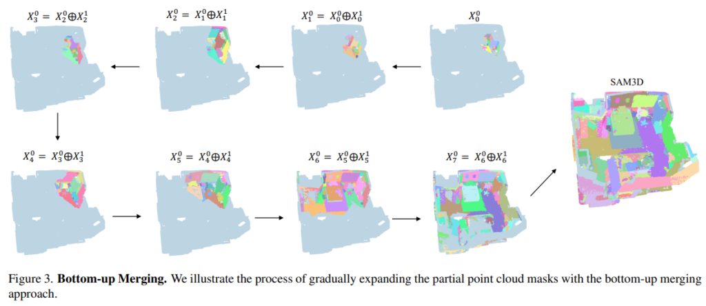 본 논문에서 실험을 진행한 ScanNet은 복잡한 scene의 경우 수백, 수천 개의 프레임으로 구성되며 각 프레임을 로컬한 포인트 클라우드에 해당합니다. Fig.3.과 같이 각 프레임의 로컬 포인트 클라우드의 마스크를 반복적인 양방향 병합 방식을 통해 전체 scene 하나의 마스크로 병합하는 bottom-up 방식을 제안하고 있습니다. 한 프레임의 로컬 포인트 클라우드를 X^1_0, X^2_0, . . ., X^K_0이라고 가정하고 여기서 K는 scene의 총 프레임 수를 의미합니다.