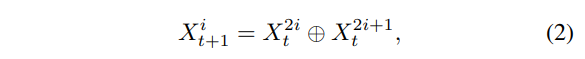 bottom-up 방식의 병합 방식을 식(2)와 같이 정의할 수 있는데, 결국 여기서 t 단계에서 인접한 두 프레임 X^{2i}, X^{2i+1}_t는 t+1 단계에서 하나의 프레임 X^i_{t+1}로 병합됩니다.
