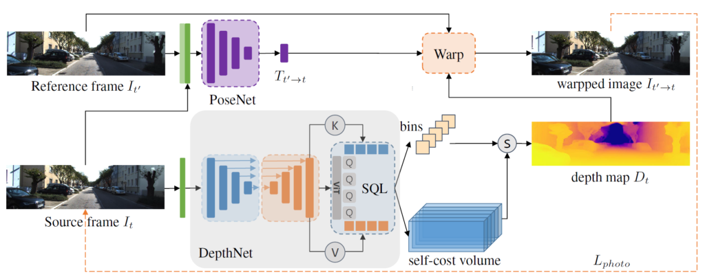 논문에서 제안하는 부분은 Depth를 추론하는 과정이며, 그 외에 reference frame과 posenet을 이용해 loss를 계산하는 과정은 기존의 monodepth2 학습 방식을 그대로 활용합니다. Self-supervised monocular depth estimation이 학습하는 방식에 대해서는 제가 예전에 작성했던 관련 논문들의 리뷰를 살펴보시면 좋을 것 같습니다. 해당 분야는 2019년 ICCV에 게재된 Monodepth2가 제안하는 학습 방식을 온전히 활용하는 경우가 많기 때문에, 하나의 논문에서 학습 방식을 제대로 이해하면 다른 논문의 학습 방식도 거의 동일하다고 보시면 됩니다.