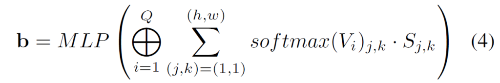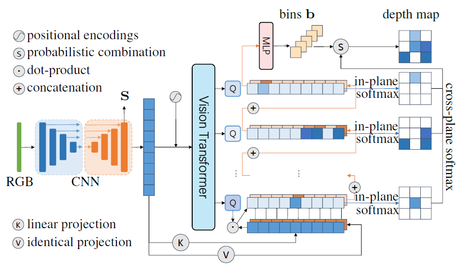 이렇게 생성된 확률 맵은 Unet의 output인 feature map S에 pixel-wise product을 수행한 뒤, 모든 픽셀을 다 더해버립니다. 즉 1x1xC 꼴의 벡터를 생성하는 것이죠. Q개의 feature map이 존재하기 때문에 이러한 연산이 총 Q번 반복되어 결과적으로 QxC 꼴의 feature가 생성이 되고 이를 MLP layer를 태워서 최종적인 depth bin을 생성하였다고 합니다.