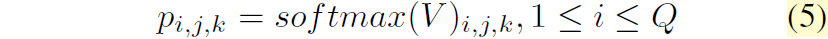 우선 feature map S와 obejct query Q를 통해 계산한 Volume V는 H x W x Q의 형태를 지닌다고 하였습니다. 여기서 저자들은 채널 축(즉 Q)에 대해 쪼개서 HxW feature map이 Q개 있는 것으로 나누고, 각각의 HxW 꼴 feature map에 대해 공간축에 대한 softmax를 취하여 픽셀 레벨의 확률 맵을 생성합니다.
