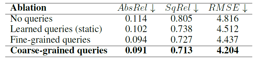 저자들이 제안하는 SQL layer가 없을 때의 성능(No queries)와 있는 경우의 성능 차이는 약 17.5% 수준으로 SQL layer의 필요성이 상당히 부각되는 모습입니다. 그리고 Learned Queries의 경우 DETR의 object query 생성 방식을 사용한 것인데, 제가 DETR의 방법론을 제대로 알지 못해서 설명드리기는 어려우나 자신들이 제안하는 query 생성 방식이 깊이 추정에는 더 좋았다는 것을 주장합니다.