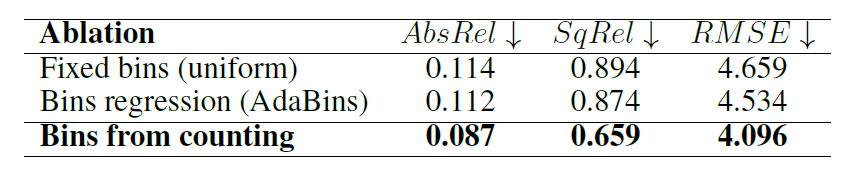 위에 실험은 bin 기반으로 깊이를 추정할 때 기존의 fixed bin 방식, Adabin의 bin 추정 방식 그리고 저자들이 제안하는 bin 추정 방식에 대한 성능 차이인데, 여기서도 재밌는 점은 저자들이 제안하는 bin 추정 방식이 가장 좋은 성능을 보였으며 그 외에 다른 bin 기반 깊이 추정 방식은 모델 성능에 큰 이점이 없었다고 합니다.