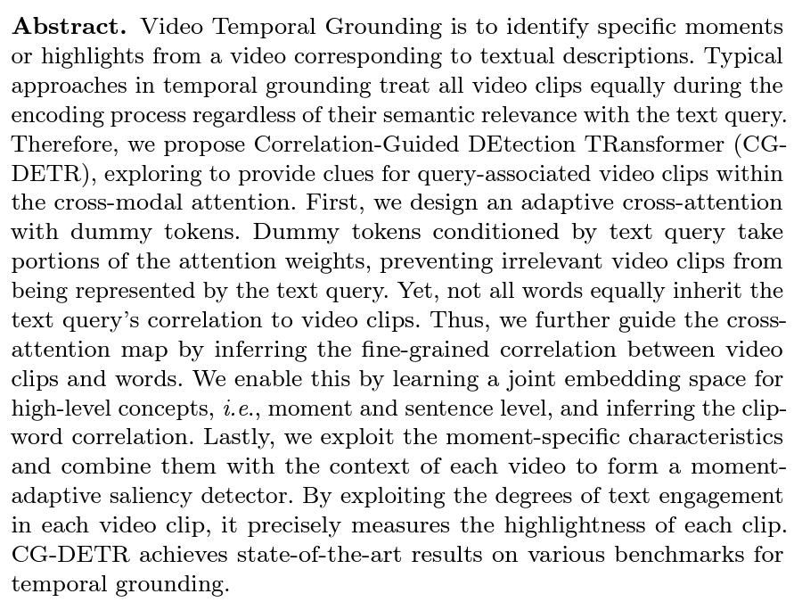 안녕하세요. 이번 X-Review에서 소개해드릴 논문은 제가 이전에 작성했던 리뷰 QD-DETR의 후속 연구 논문 CG-DETR입니다. QD-DETR과 동일한 성균관대 한국인 박사님의 연구이며, ECCV에 제출한 뒤 이제 리비전을 거치고 있는 상황으로 보입니다. QD-DETR의 후속연구답게 QD-DETR의 문제점을 바탕으로 새로운 모듈들을 제안하게 됩니다. 자세한 내용은 이제 차차 알아보겠습니다.