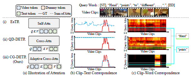 그림 1의 (c)는 비디오 클립과 문장 단위 모델링에서 하나 더 들어가 클립과 문장 내 단어 단위의 모델링 또한 수행하는 CG-DETR의 장점을 보여줍니다. (c) 또한 attention weight에 해당하는데, GT 구간 내 높은 weight를 갖는 단어들(밝은 색)을 볼 수 있습니다. 이는 문장 내에서도 중요한 의미를 갖는, 중요한 역할을 하는 단어들이 강조되고 있는 것으로 해석해볼 수 있습니다. 결국 위 그림 1을 통해 알 수 있는 것은, CG-DETR에서 이전보다 더 fine-grained한 비디오의 “클립”, 텍스트 쿼리 문장 내 “단어” level로 모델링이 이루어졌다는 것입니다.
