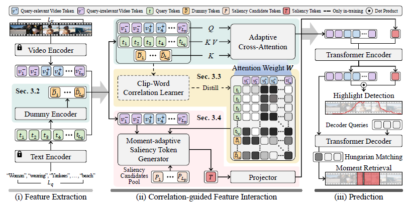 L_{v}개의 클립으로 구성된 비디오 V = [v_{1}, \cdots{}, v_{L_{v}}]L_{q}개의 토큰으로 구성된 텍스트 쿼리 Q = [q_{1}, \cdots{}, q_{L_{q}}]가 입력으로 주어집니다. 이를 활용해 HD에 대한 예측값 clip-wise saliency score \{s_{1}, \cdots{}, s_{L_{v}}\}와 MR에 대한 예측 구간을 (m_{c}, m_{\sigma{}}) 형태로 얻어내는 것이 목적입니다. m_{c}는 중간 지점, m_{\sigma{}}는 너비를 의미합니다.