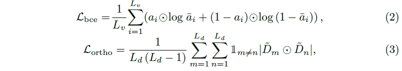 수식 2에서 \bar{a}_{i}=\Sigma{}_{j=1}^{L_{q}}W_{i, j}는 i번째 클립에 대한 문장 전체의 attention weight를 의미하며, a_{i}는 HD를 위한 GT 라벨을 의미합니다. 구간이 Highlight에 해당하면 \bar{a}_{i}는 1로, 아니면 0으로 향하도록 학습하는 \mathcal{L}_{bce}입니다. 이렇게 GT 구간의 weight 값을 크게 만들어줌으로써 Dummy token들이 정확히는 규정할 수 없지만 텍스트 쿼리와 반대되는, 또는 배제하는 의미를 갖도록 학습될 것입니다. 수식 3번의 \mathcal{L}_{ortho}는 벡터의 내적이 0이면 서로 orthogonal 하다는 성질을 이용해 Dummy token 각각이 서로 다른 의미를 갖도록 학습하게 해주는 역할을 수행합니다.