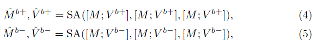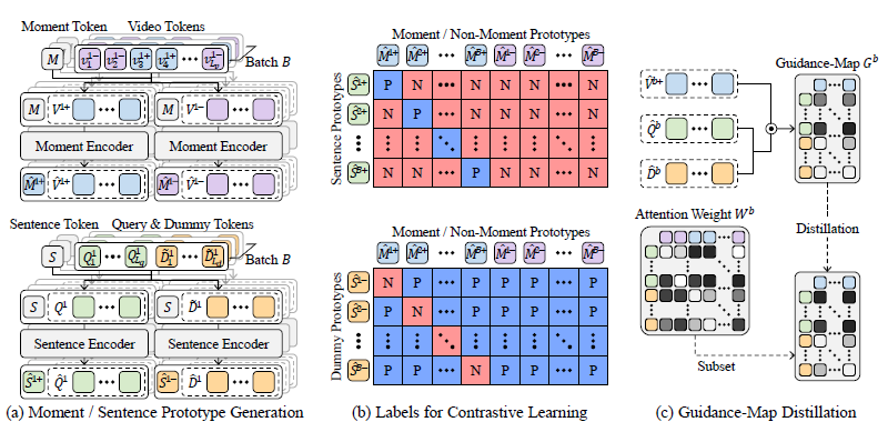 Supervision이 가능한 moment-sentence level의 embedding space를 구축하기 위해서, 라벨을 활용해 각 모달리티의 moment prototype과 non-moment prototype을 생성해줍니다. 즉, Moment, sentence token을 구축한 뒤 contrastive learning을 수행하는 것입니다. 그림 4-(a)를 보면 비디오는 saliency label이 있으므로 보라색의 negative와 파란색의 positive로 나눠진 것을 볼 수 있습니다. 이후 Moment token M을 concat하여 self-attention을 거쳐줍니다. 이 과정은 아래 수식 4, 5와 같습니다. 수식 4, 5의 출력이 비디오의 moment prototype, non-moment prototype에 해당하는 것입니다.