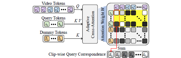 각 클립이 텍스트 쿼리와 얼마나 상응하는지를 고려할 가중치를 위 수식 1과 같이 얻을 수 있습니다. 처음에는 keyvalue의 shape이 안맞아 뭔가 이상하다고 생각했는데, value에 곱해주는 weight W_{i, j}j 인덱스가 더미를 제외한 쿼리 개수만큼까지 사용되고 있었습니다. 그림 3을 통해서도 이 과정을 확인하실 수 있습니다. 그렇다면 dummy token D가 쿼리를 제외한 의미를 가지는 토큰으로 만들어주기 위해서는 학습이 별도로 필요할 것입니다.
