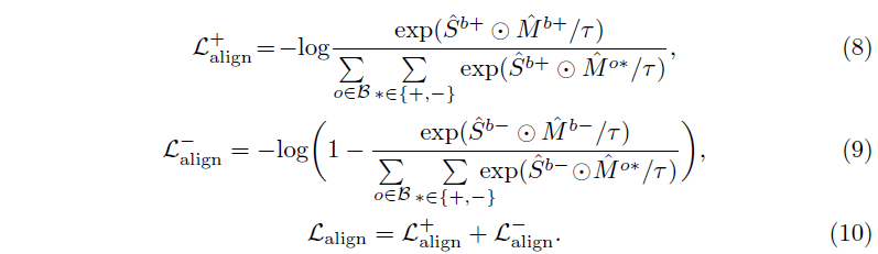 비디오는 라벨이 있었으니 positive, negative를 직접적으로 정의할 수 있었습니다. 텍스트와 비디오의 positive 관계는 명시적으로 정의되어있다고 하더라도 negative, 즉 반대되는 텍스트가 라벨링 되어있는 것은 아닙니다. 하지만 앞선 절에서 활용한 Dummy token이 이러한 역할을 수행하도록 학습되고 있었습니다. 따라서 텍스트 토큰을 positive, dummy token을 negative로 두어 위 수식 4, 5와 동일한 과정을 거칩니다. 여기엔 M 대신 Sentence token S를 사용합니다.