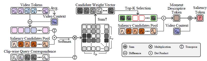 이후 candidate weight vector에서 top-K개만을 뽑아 엮어 Moment descriptive token으로 사용합니다. 최종 saliency token TV_{ctx}와 moment descriptive token을 더해 만들어줍니다.